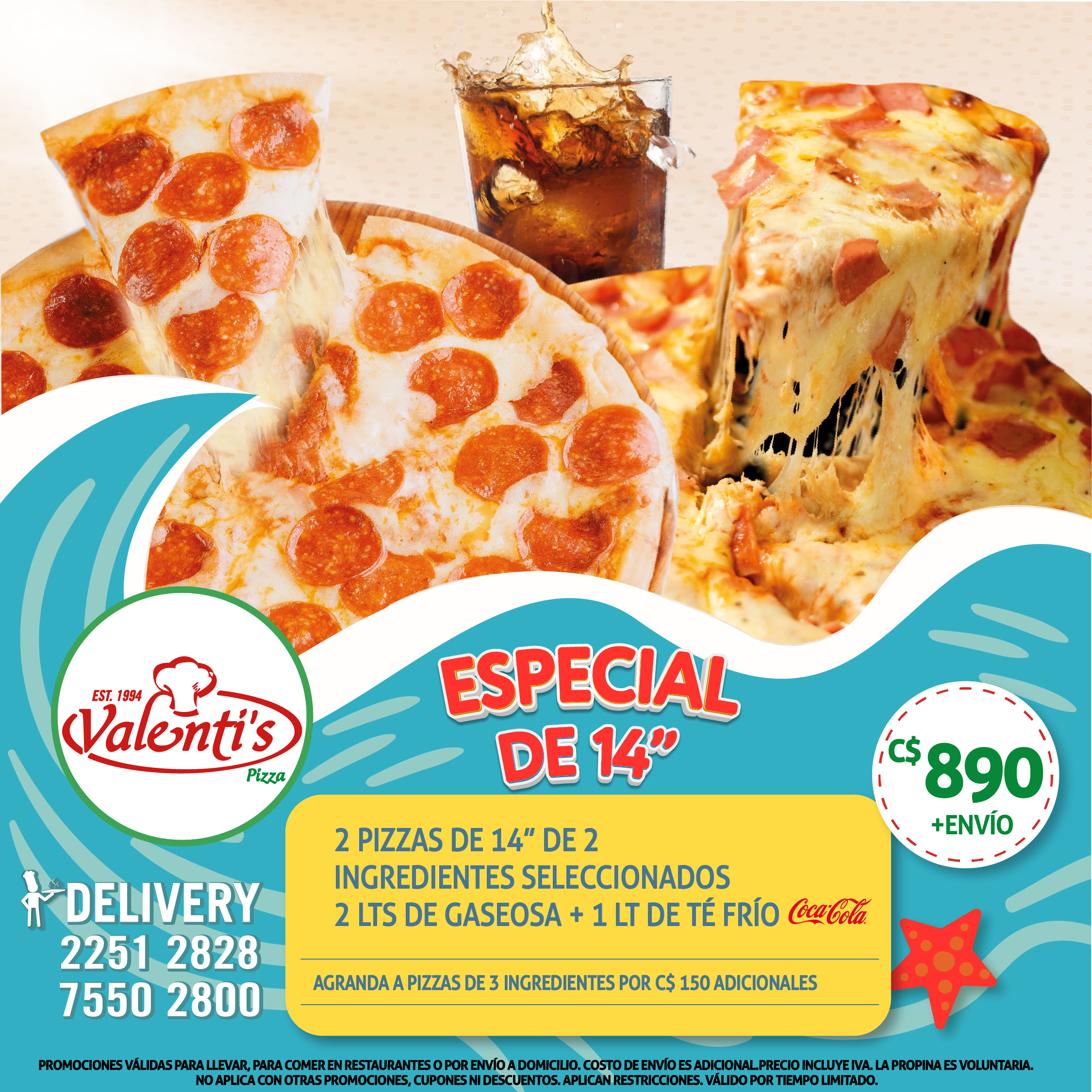 - 2 Pizzas de 14″ de 2 ingredientes seleccionados.